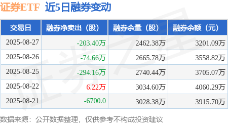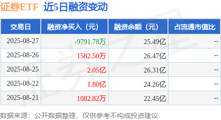 本站消息,8月27日,证券ETF(512880)融资买入6.7亿元,融资偿还7.68亿元,融资净卖出9791.78万元,融资余额25.49亿元,近20个交易日中有14个交易日出现融资净买入。